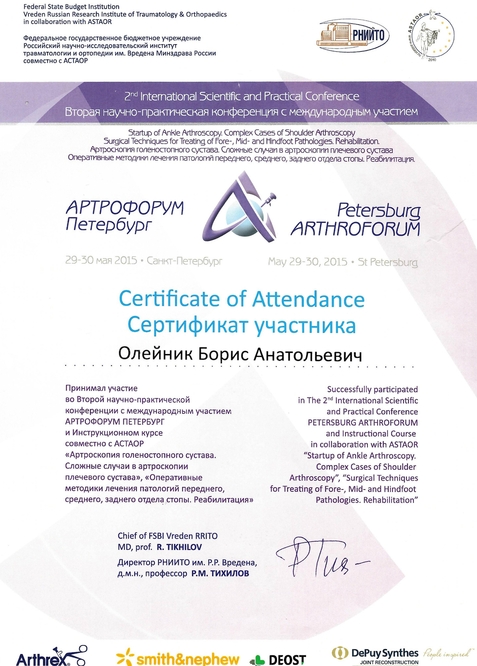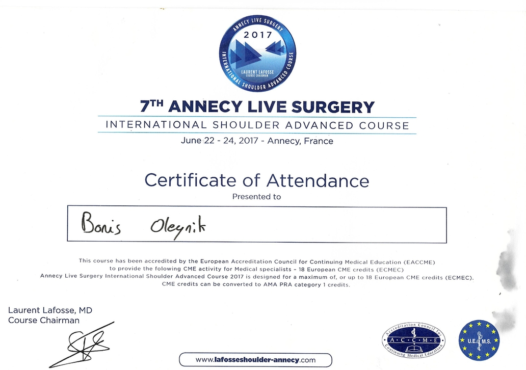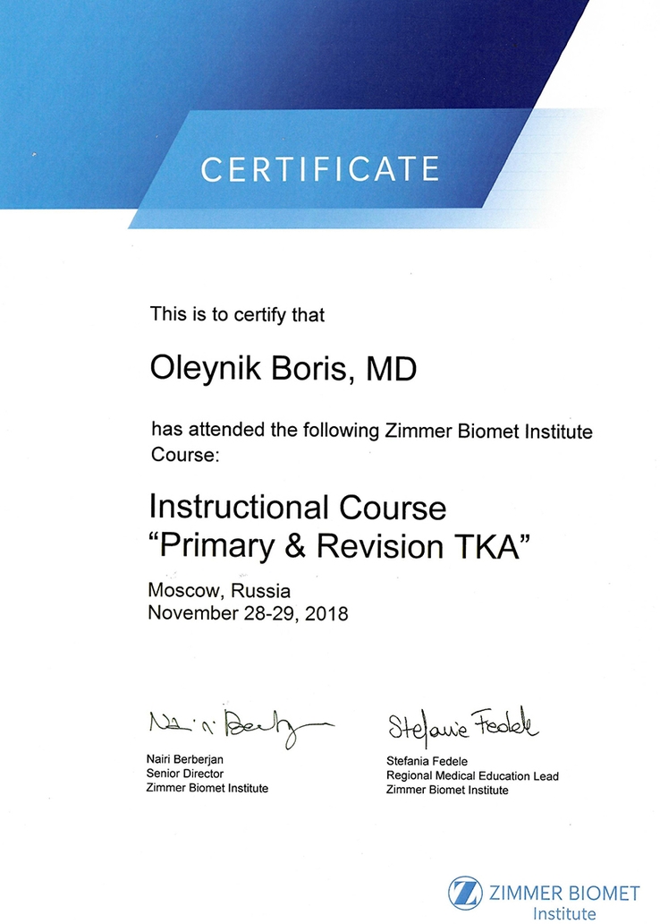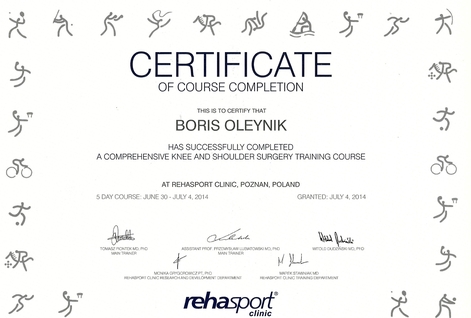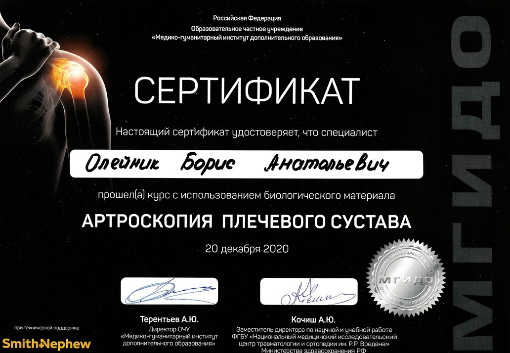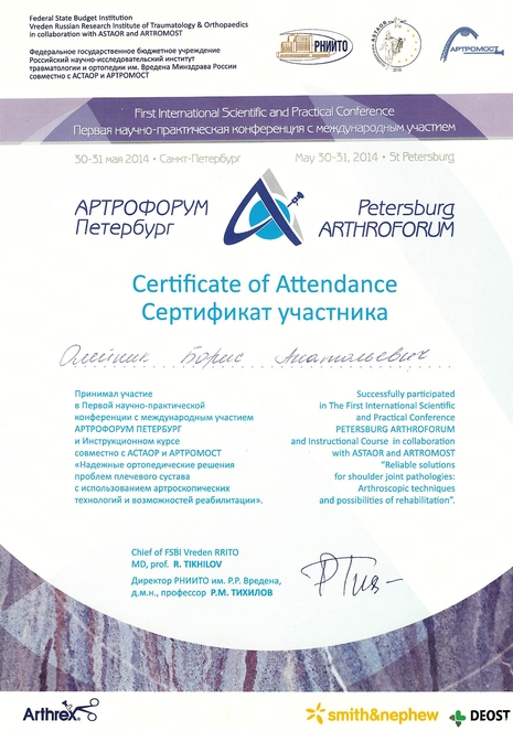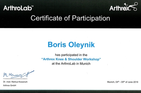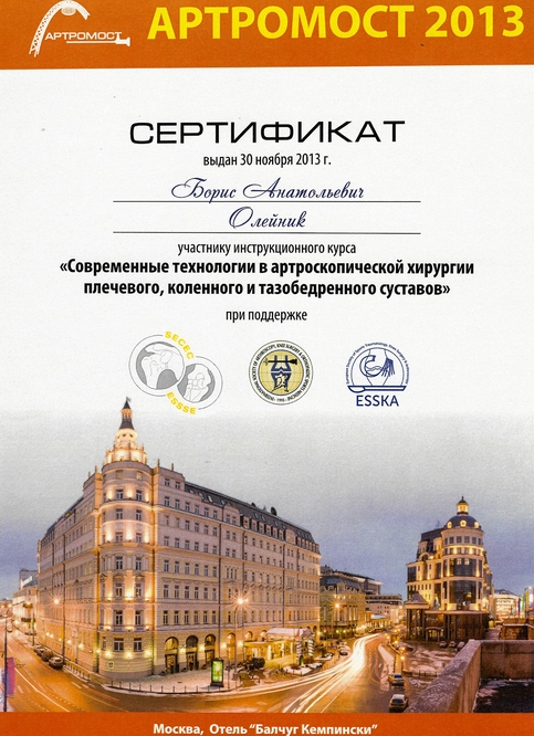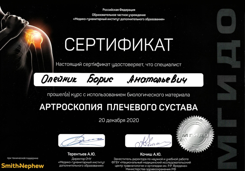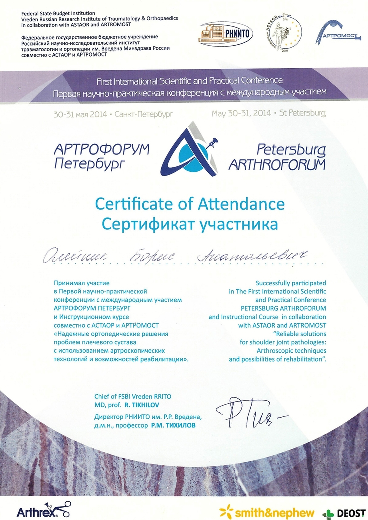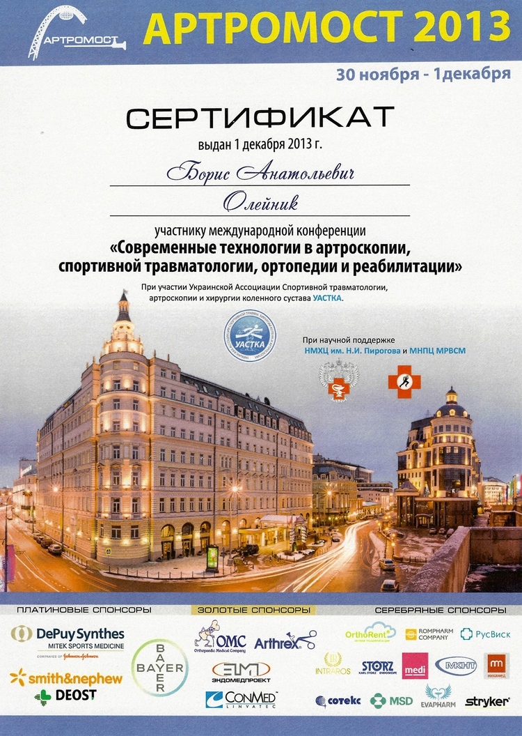 — лектор-инструктор на cadaver-курсах по артроскопии компании Smith & Nephew